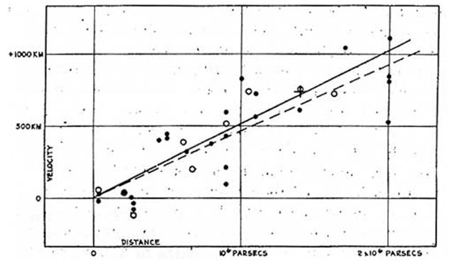 شکل 1 رابطه خطی بین سرعت و مسافت کهکشانها بر حسب دادههای بدست آمده از 46 کهکشان توسط هابل (1926). خط سیاه پر بر حسب دادههای بدست آمده از 24 کهکشان است که فاصله آنها به طور جداگانه محاسبه و با دایره توپر نشان داده شده اند. خط چین مربوط به سایر دادهها است که فاصله آنها به صورت گروهی تخمین زده شده است.
